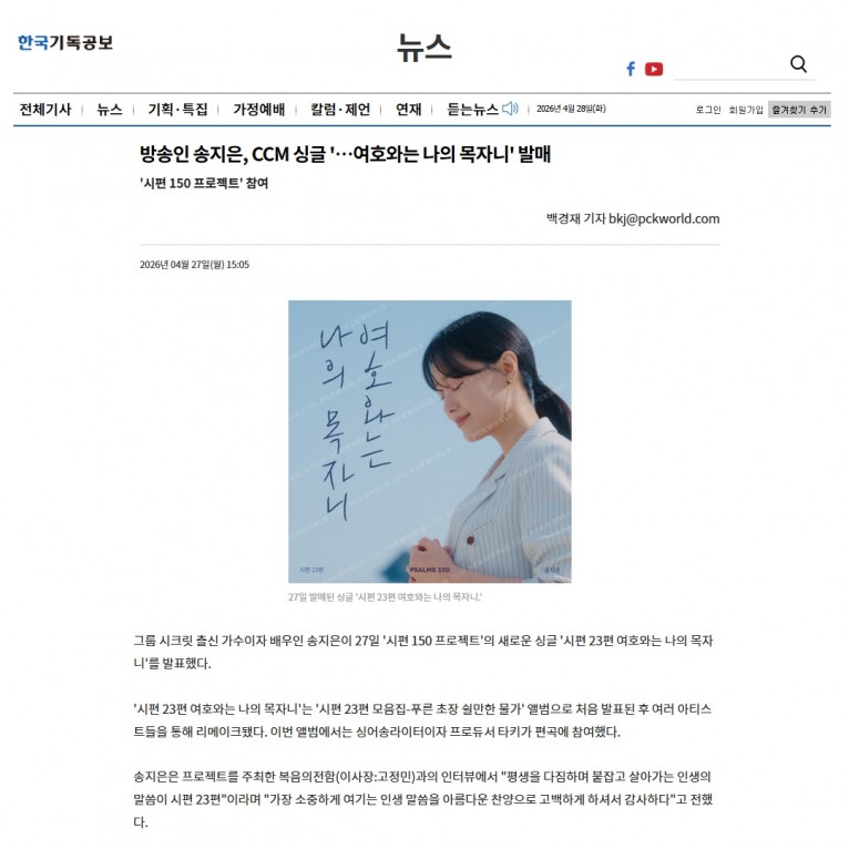 [기사] 방송인 송지은, CCM 싱글 '…여호와는 나의 목자니' 발매(한국기독공보)