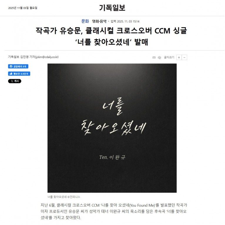 [기사] 작곡가 유승문, 클래시컬 크로스오버 CCM 싱글 ‘너를 찾아오셨네’ 발매(기독일보)